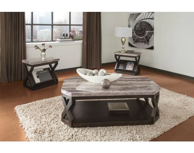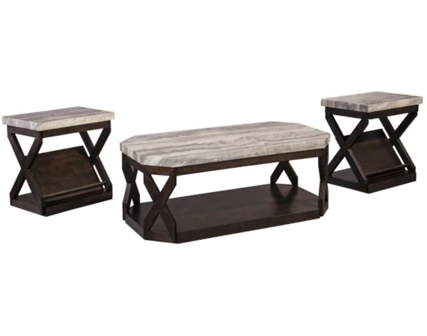 Add eye-catching, contemporary appeal to your home with this elegant set of tables, including a 48″ W x 24″ D x 19″ H coffee table and two 24″ W x 16″ D x 24″ H end tables. The striking design features distinctive X-stretcher supports, canted edging, smooth, faux marble tops and open magazine and display shelves. The coffee table has built-in casters for effortless movement during any get-together. You’ll create a sophisticated, modern look and feel in any living space with the rich wood finish and textured, multi-tone marble.LOC 9C
