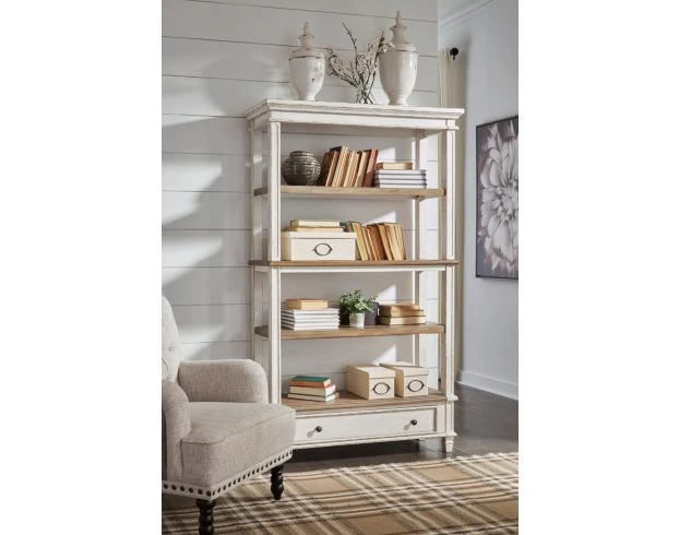 Elevating the art of cottage styling, this traditional 75-inch bookcase is your heavenly home office realized. Antiqued two-tone esthetic blends a chipped white with a distressed wood tone top for added charm. Clever balance of shelf and drawer space adds a beautiful and functional touch. LOC 3E