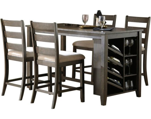 Charming looks and function make this counter set a must-have. Wood construction, a trestle base, a unique shelving area on the side of the table and four side chairs make this set irresistible. The dark wood finish complements any dining space nicely.