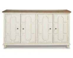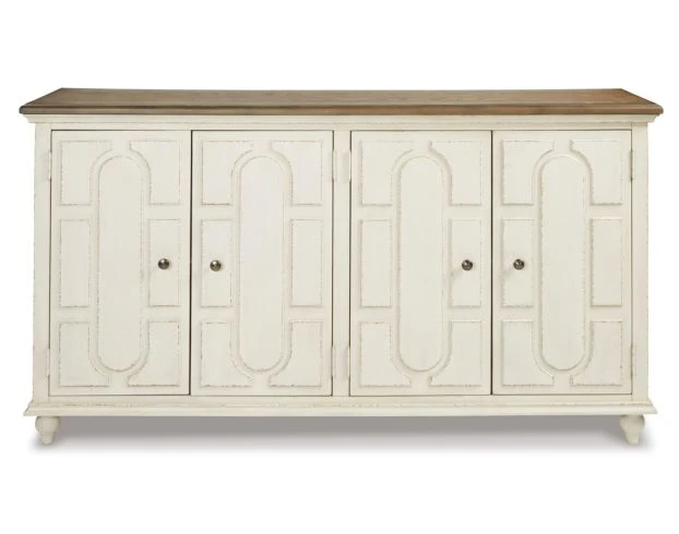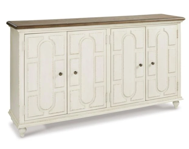 Fall in love with this accent cabinet. Crafted from wood, this piece features a two-tone finish of white and brown. The cabinet door fronts have elegant carvings complemented with bronze-tone metal door handles. Place this in your living space or entryway to complete the look. LOC: 7E