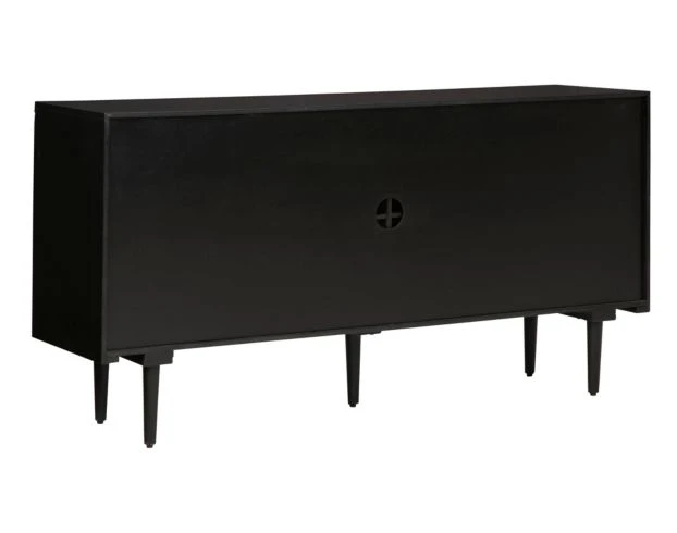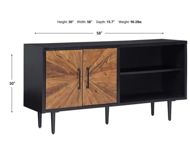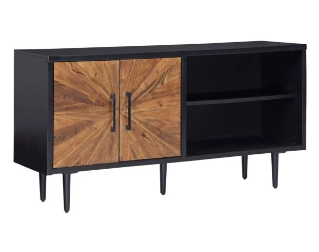 Lend a sense of casual style and a hint of urban flair with this Ashley Shayland accent cabinet. This versatile piece has two open air shelves to display accessories or decorations. Behind the starburst pattern door fronts and black metal door pulls is additional storage space. The black finish of the accent cabinet contrasts the medium brown finished doors, elevating this storage solution to a stylish must-have.