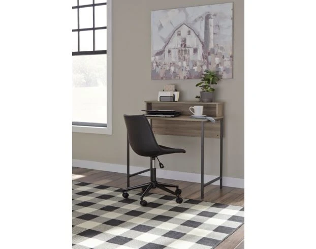 Add charm to your office space with the Ashley Titania Desk. It features a shelf above the desk for storage, metal framing, and light wooden finish that highlights the clean lines. It provides the perfect look for any transitional space.