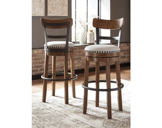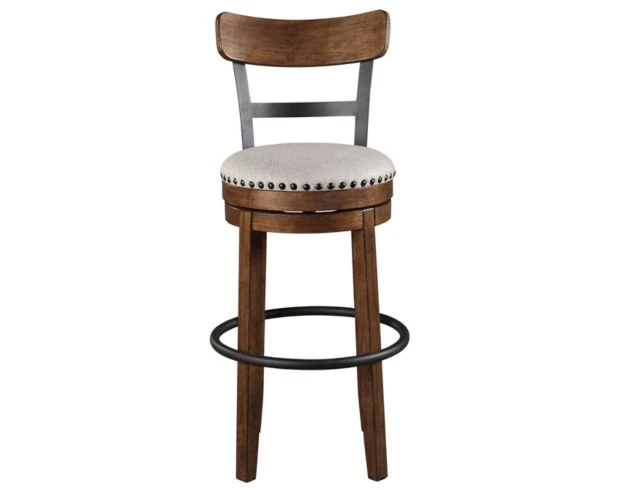 Add personality to your home with this swivel bar stool. The impressive design features black-finished metal accents, a linen-colored polyester upholstered cushion and nailhead trim.