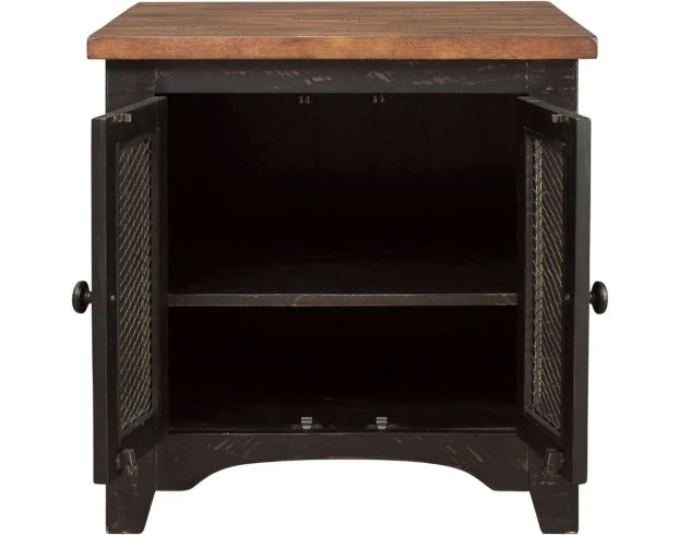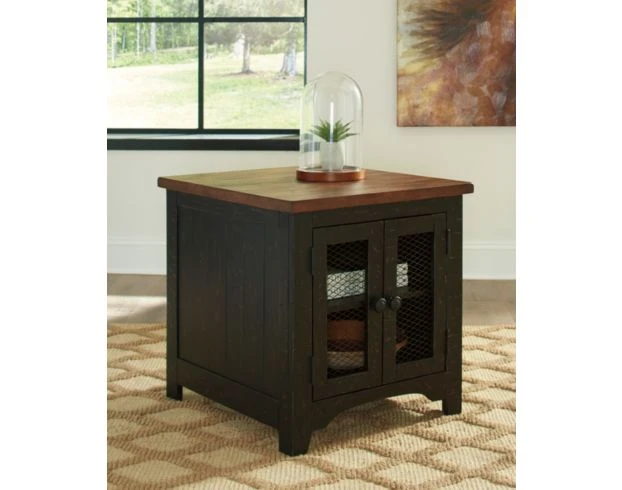 Create the perfect rustic look in your living space with this end table. Its two-tone finish, double-door cabinet, designer touches and industrial brackets create an inviting look and feel for the perfect modern farmhouse design. LOC: 7E