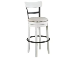 Create the perfect dining space with this swivel bar stool. The impressive design features black-finished metal accents, a linen-colored polyester upholstered cushion and nailhead trim.