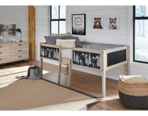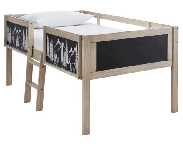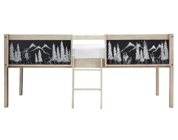 Give your kids the chance to change up their style with this twin loft bed. This loft-style bed features a sturdy wood construction plus chalkboard panels that allows your kiddos to create their own designs. This piece offers a ladder leading to the top bunk, side panels, and spacious underneath space for a bookcase or storage box (sold separately). The light wood finish paired with the black chalkboard panels flaunt a modern look for the ultimate bedroom addition.