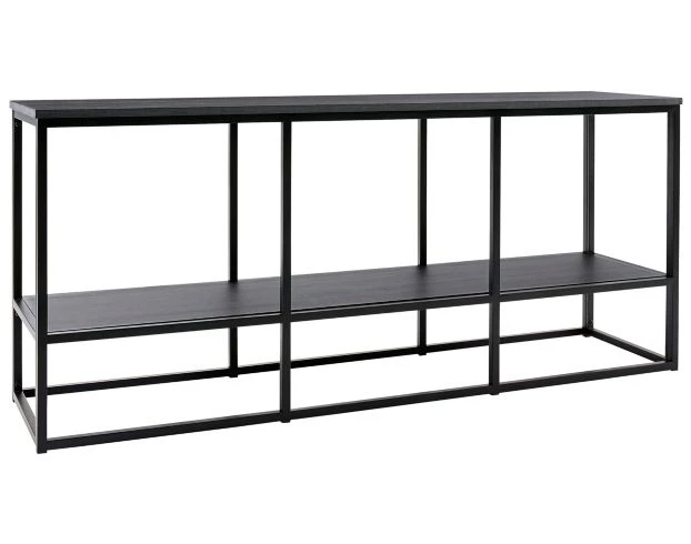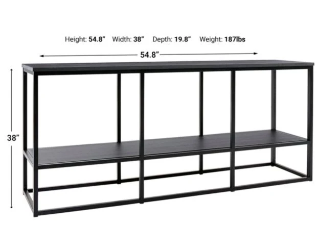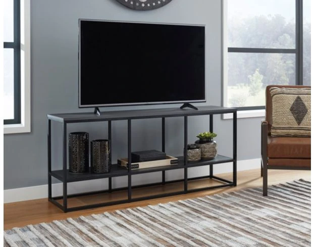 The Ashley Yarlow 65-Inch TV Stand would suit any living room, rec room, or den. The top surface features a dark wood grain with a linear black metal frame. The open-concept design of the frame creates an airy look. Showcase décor or electronics on its lower shelf to make the perfect entertaining room. LOC 7C