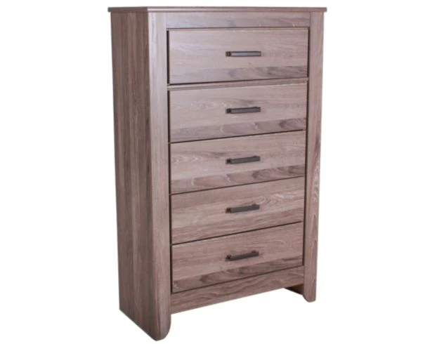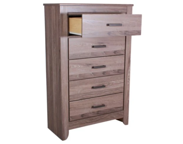 Add casual style and ample storage to your bedroom with this chest. The vintage-inspired design features five spacious drawers with smooth side glides and aged pewter hardware. The warm gray finish showcases the clean lines and white wax details, creating a cozy, contemporary look. Additional features include: side roller glides, aged pewter hardware, laminate construction