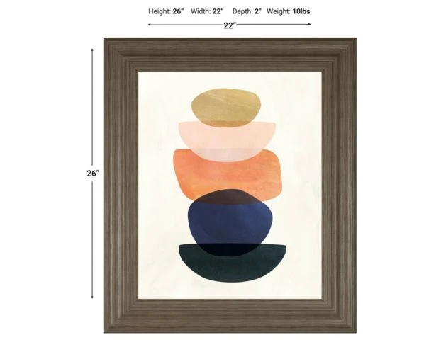 The Mod Pods II artwork features multi-colored geometric shapes. The shapes stack on top of each other in hues of green, blue, orange and brown. The artwork is encased in a wooden brown frame. Add this piece to your living room, office or bedroom.
