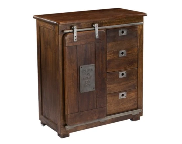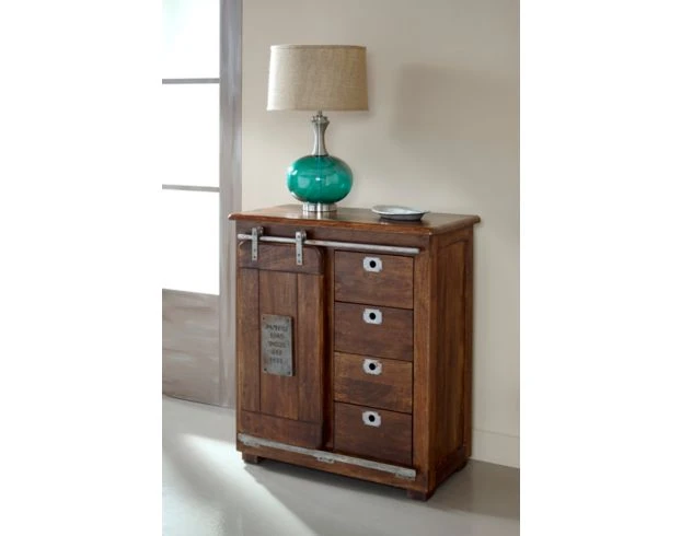 This handsome cabinet offers ample storage space, including four drawers and a sliding barn door that opens to reveal spacious shelving. The rich brown finish showcases the metal accents and rustic design, creating an eye-catching look. LOC:2F