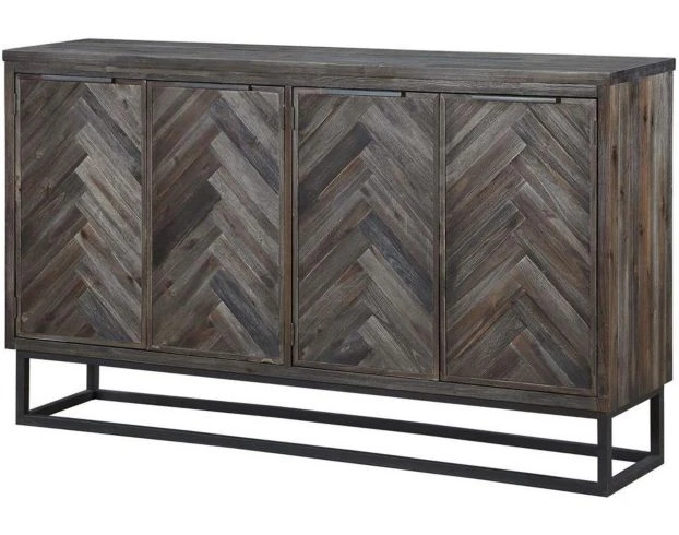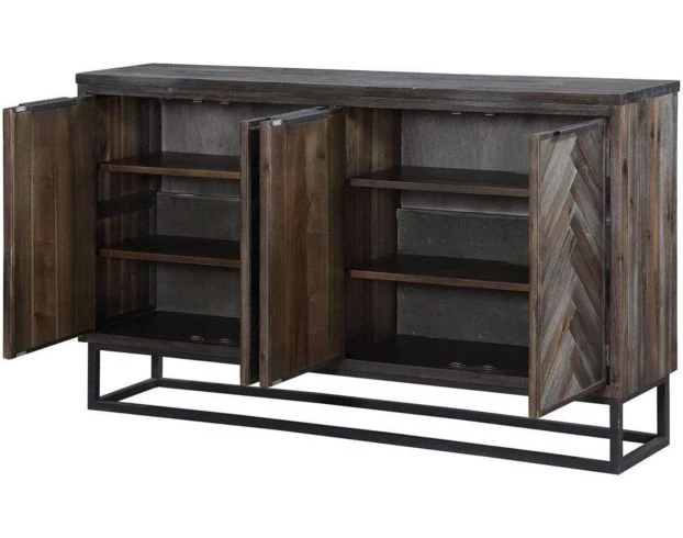 The Coast To Coast Aspen Court Brown Four-Door Media Console is the perfect size for your living room, rec room, or den. It features a unique design with a chevron pattern on the four front doors and an open metal base. Crafted with wood, this piece features cord management for entertainment devices. The rich, dark finish adds a hint of rustic to your color palette.