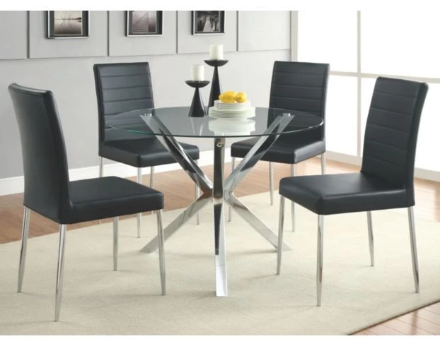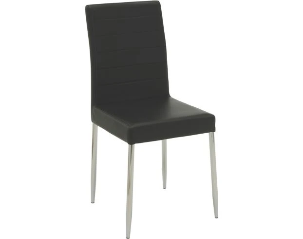 Pull up a chair in comfort and style with this handsome side chair. The stylish design features a fully padded seat and back wrapped in chic faux leather. The black hue and sleek legs make it a must-have for your contemporary dining room. LOC: 8I, LOC: 9I