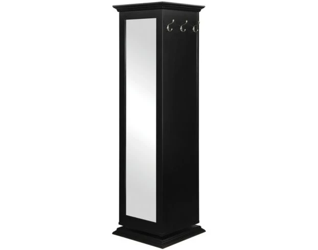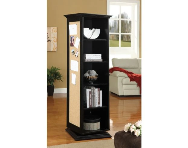 Bringing convenience to another level, this swivel cabinet offers a different feature on every side. From storage compartments to a cork board, this piece has it all. The black contemporary design provides this piece with a neutral look that could mix with many styles throughout any room in your home.