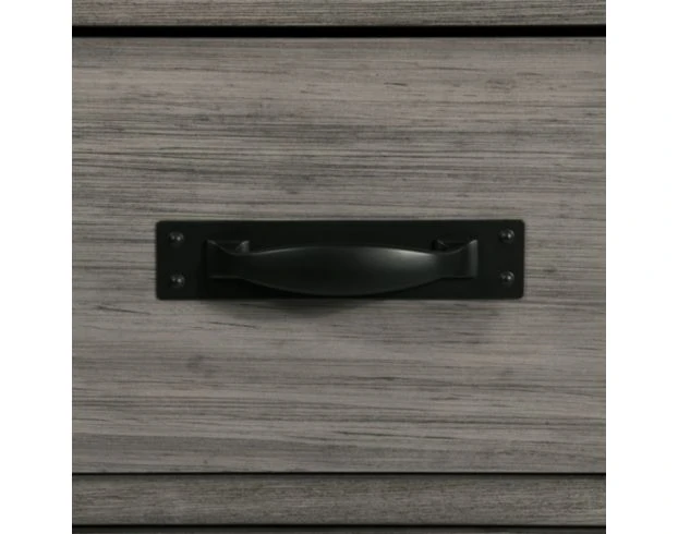 Rustic detailing and modern clean lines combine with the Wade collection. This sleek door chest features pine construction, black pulls, dust-proofing, a felt-lined top drawer, nailhead detailing, a door that opens to reveal two shelves and five drawers with dovetail construction. The rustic gray finish is perfect for any palette.