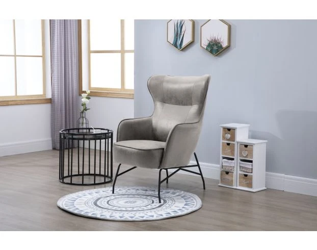 Find comfort and sophistication in your home with this accent chair. It flaunts a sleek silhouette with its gray faux-leather upholstery, tight back, and flair arms. The piped edges and stitching detail rests on straight black metal legs to enhance its rich, modern look. LOC 6C