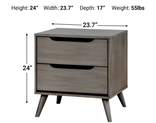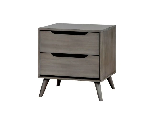 Bring mid-century modern style to your space with the Lennart gray nightstand. It features splayed legs, dovetail joints, ball-bearing glides, and two recessed drawers. This durable piece is constructed from solid wood and veneers. The gray wood finish will complement any color palette.