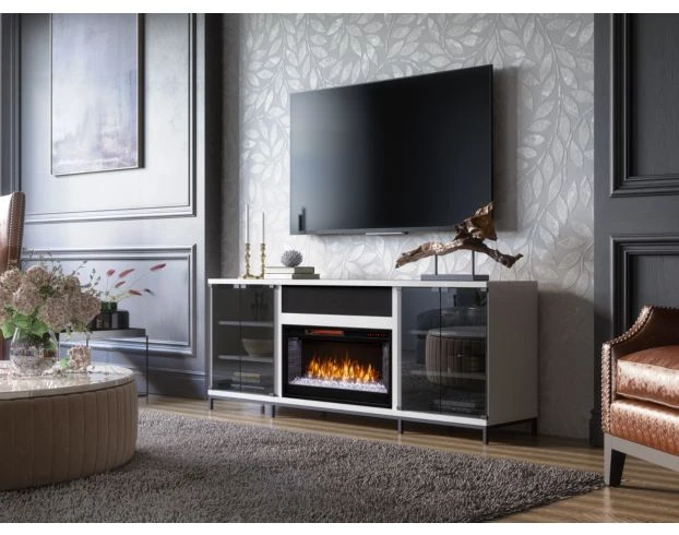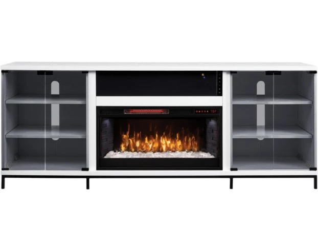 Add functionality and warmth to your space with this Greentouch USA Fullerton media fireplace. Its center electric fireplace has two cabinets with two adjustable shelves each on the sides and glass doors. This large piece can support up to a 70-inch TV and a beautiful white oak look. LOC:6I