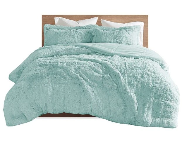 This two-piece aqua twin/twin XL comforter set brings a soft contemporary update to your bedroom. The comforter and sham feature stylish shaggy faux fur that creates a soft fluffy texture and modern look. The solid plush reverse adds a soft and warm touch. Items in the set may come in a rolled or compressed packaging, which will need to be fluffed up or steam ironed before use to remove wrinkles.