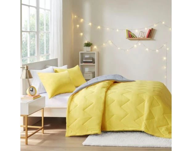 The Trixie Reversible Twin Comforter Set is a fun way to add color to your bedroom. The ultra-soft microfiber comforter is exceptionally soft and displays a light grey color with a bright yellow reverse, for a striking look. Chevron quilting adds dimension and charm to the colorful comforter, while matching shams feature a hidden zipper closure for clean and finished edges. Fully reversible and machine washable, this vivid comforter set is easy to care for and makes changing the look of your bedroom a breeze with one easy flip. This comforter set is also OEKO-TEX certified, meaning it does not contain any harmful substances or chemicals to ensure quality comfort and wellness. Set includes: one comforter and one sham.
