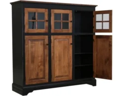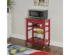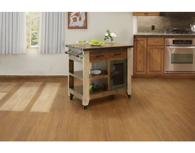 Add additional counterspace to your kitchen with this adorable mini-island. The impressive design features solid pine construction, a small door that conceals two shelves, two outer shelves, one spacious drawer and nailhead accents. The multi-tonal finish of this piece makes it perfect for any rustic palette.