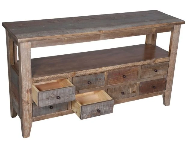 Form and function combine with this eye-catching sofa table. It offers ample storage space, including a generous top, a large open shelf and eight convenient drawers. The distressed, multi-hued finish showcases the casual design, adding vintage-inspired style to your space. LOC: 8F, 10F