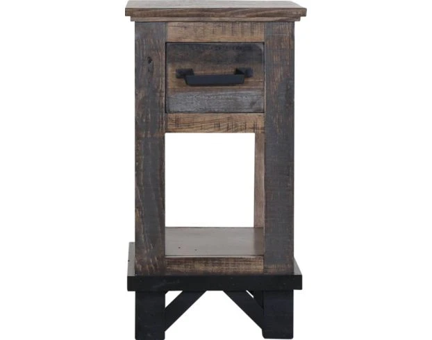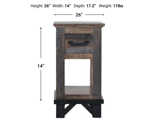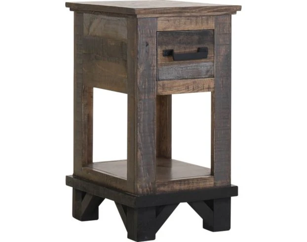 Center your living space with this industrial chairside table. Crafted with solid pine wood, this piece features one smooth-gliding drawer with English dovetail drawer construction, mortise and tenon corner construction, and plank detailing. The black drawer handles complement its dark textural grain finish to highlight any rustic living space. Due to the hand-painted finish some variations may occur. LOC: 7F