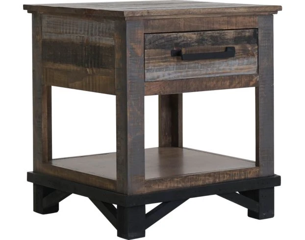 Center your living space with this industrial end table. Crafted with solid pine wood, this piece features one smooth-gliding drawer with English dovetail drawer construction, mortise and tenon corner construction, and plank detailing. The black drawer handles complement its dark textural grain finish to highlight any rustic living space. Due to the hand-painted finish some variations may occur. LOC: 11H