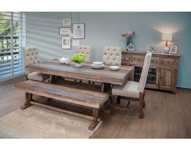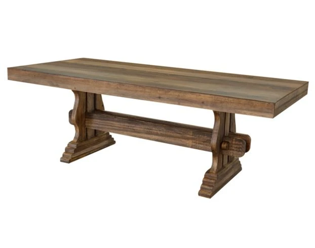 Introduce rustic styling into your home with this dining table. Crafted with solid mango wood, this piece sports a durable trestle base with unique wooden detailing. The elongated top offers plenty of room for the entire family, while the natural finish adds a hint of style.