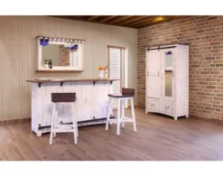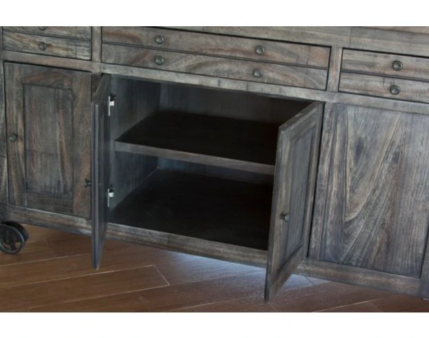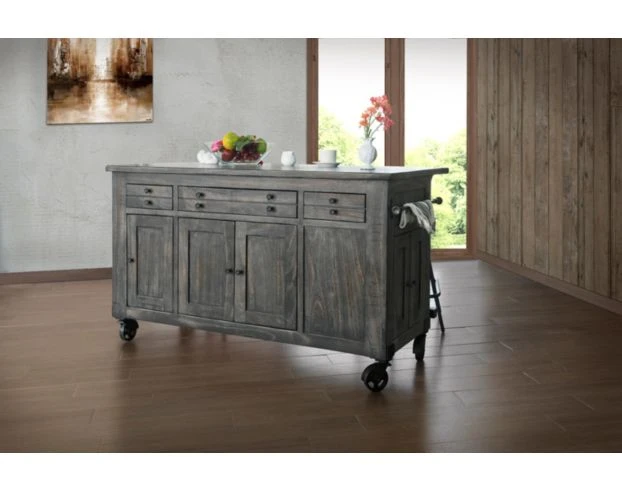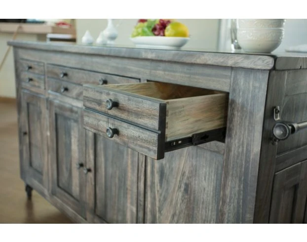 Add chic, yet rustic design to your home with the Moro collection. This gorgeous kitchen island features solid Parota wood, mortise and tenon case construction, three spacious drawers with smooth ball bearing glides, a towel hanger and an overhung top that allows for counter-height seating on one side. The gray-toned finish of this piece is perfect for any rustic palette.
