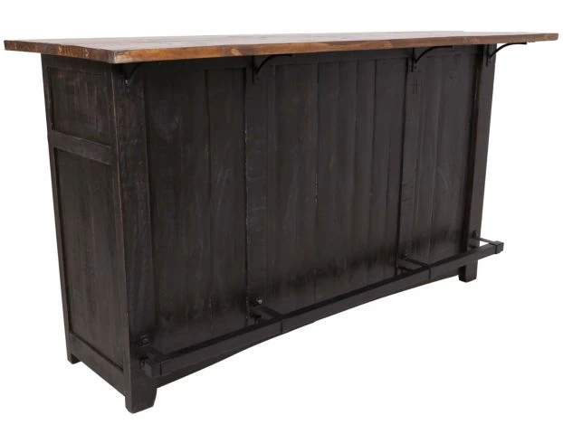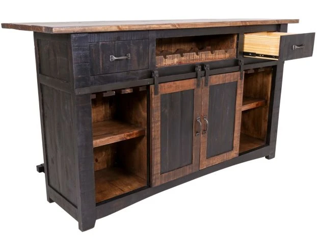 Entertain the night away with this stylish bar. You’ll have plenty of room for all of your supplies with two utility drawers, a fixed shelf behind two sliding barn doors, wine storage for five bottles and an attached cast iron bottle opener. A southwestern flair can be found in style details such as the metal footrest, wrought iron accents and two-tone contrast between black antique finish and rich brown stain. LOC: 0