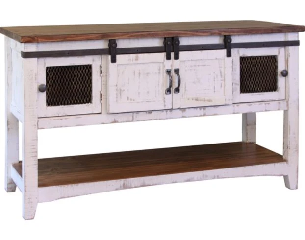 Create a cozy retreat with this sofa table. It features 100% solid pine, a multi-step white finish on distressed wood, a medium brown stain on the top and barn doors with functional rolling mechanisms to add a unique look. This table complements any living room, giving it a warm, rustic feel. LOC: 10E