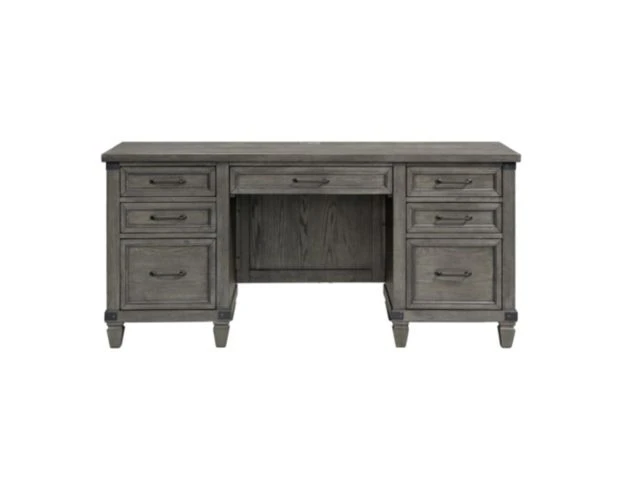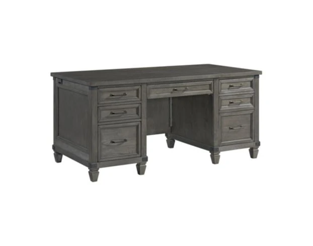 Give your home office an elegant inclusion with this executive desk. A total of seven English-dovetailed drawers give you the potential to organize and store your supplies and files just the way you want. The brushed pewter finish and the aged iron pulls provide a sophisticated look for your space.