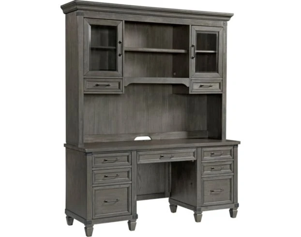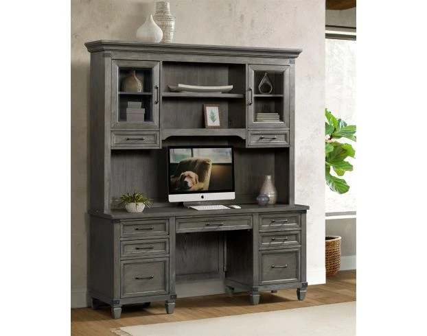 Give your home office an elegant inclusion with this hutch. When added to the matching credenza, it gives you an additional two English-dovetailed drawers, two cupboards with shelves, and two open shelves in the center. The brushed pewter finish and the aged iron pulls provide a sophisticated look for your space.