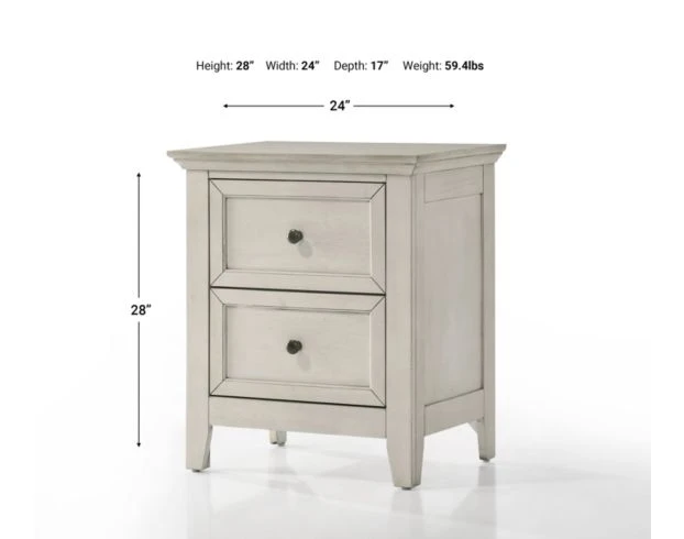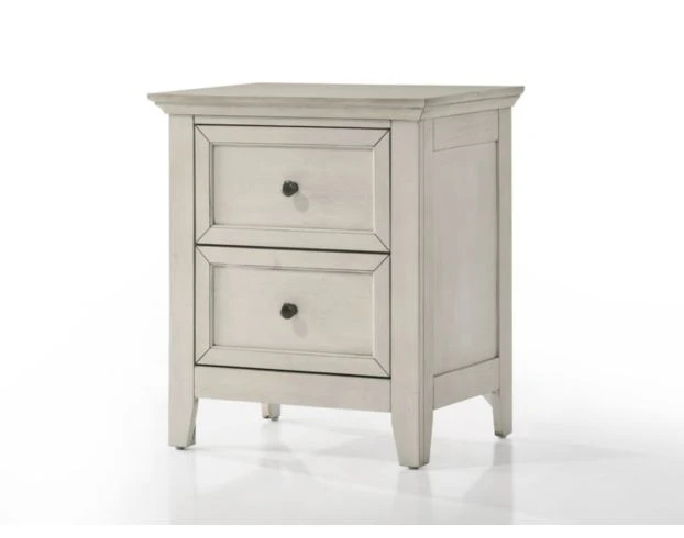 The San Mateo nightstand brings transitional style to your room. It features two drawers with dovetail joints, ball bearing glides and pewter hardware. It is constructed from solid wood and has a white finish. This nightstand provides both style and function.