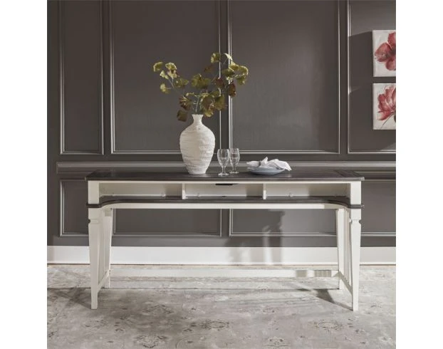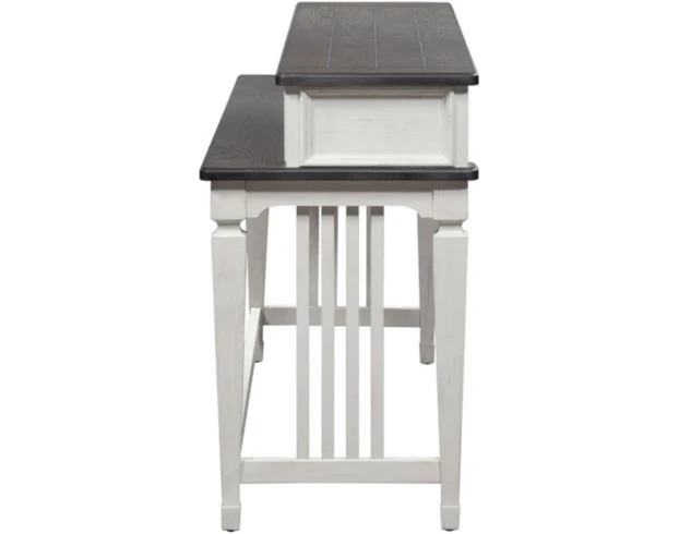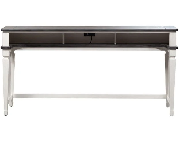 Create the perfect transitional style with the Liberty Allyson Park Console Bar Table. It features two electrical outlets, two USB ports, and a shelf. The light wooden oak elegantly accents its dark top for the perfect living room accessory. Location: 0