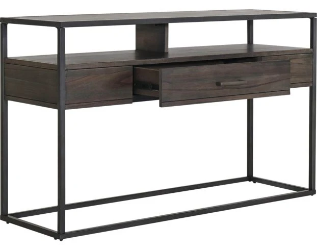 This sofa table is just what you need to simplify your urban space. It’s crafted of rubberwood solids, metal tubes, and mindy veneers, plus features a tobacco finish, a full extension drawer, an open storage shelf, and a beveled glass top. Add this table to any contemporary space for superb style. LOC: 6H, 9D