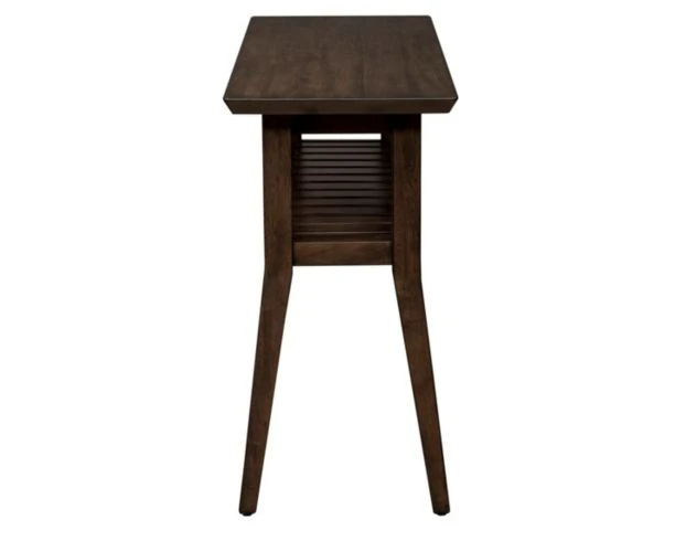 Transform your space with the Ventura Boulevard sofa table. Crafted of rubberwood solids and cathedral walnut veneers, this piece features a bronze spice finish, bottom slat shelf for additional storage, anchored by tapered splayed legs. This contemporary sofa table would be a great addition to any space. LOC:8E