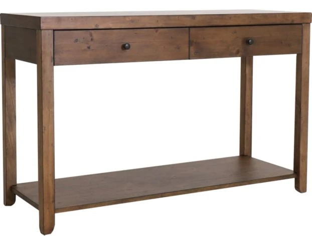 Transform your space with this transitional sofa table. Crafted of poplar solids and cedar veneers, this piece features a nutmeg finish, four-way fancy face veneer top, two fully stained drawers accented with appealing antique brass knob hardware, and one shelf for additional storage, anchored by block tapered legs. This simple yet sophisticated sofa table will make a great addition to your home.