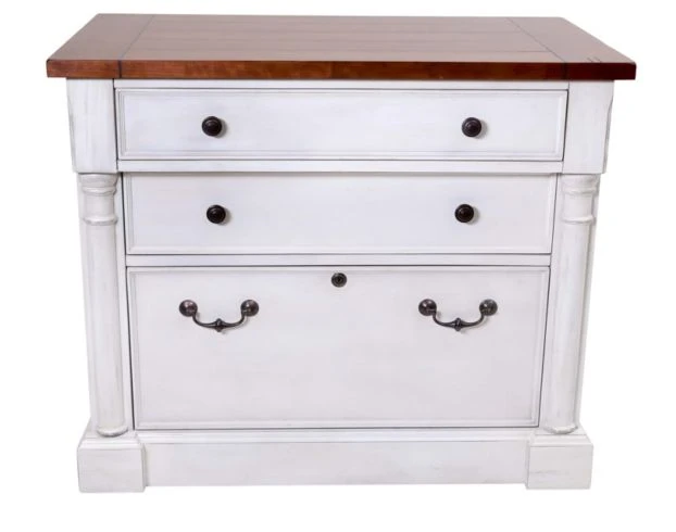 Upgrade your office space with this handsome lateral file. It features three drawers with ball-bearing glides that hold letter or legal-sized files. It also includes locking mechanisms and classic hardware. The weathered finish and two-toned cherry design create a charming look that complements any country home office.