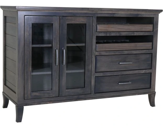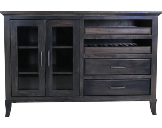 Add style and organization to your space with this charming buffet. It features solid maple wood, two drawers, two doors with glass inlays that open up to roomy shelving space and two pull out trays. The dark wood finish is a chic accent to any space.