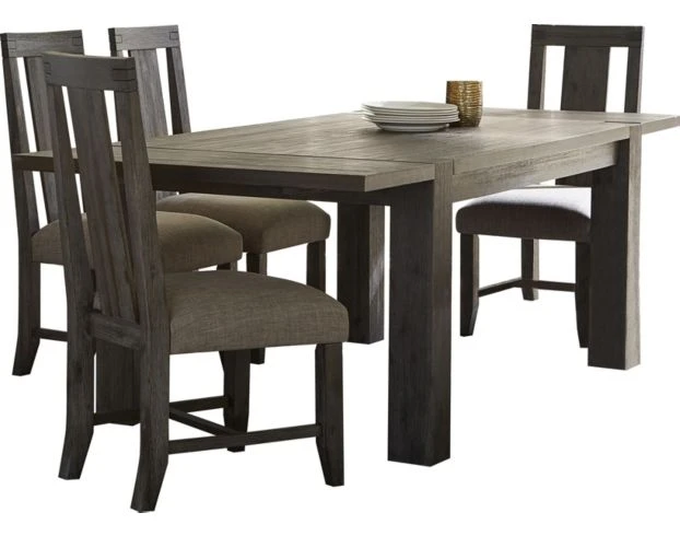 Charm your dining space with visually appealing furniture like the Modus Furniture Meadow 5-Piece Dining Set. It features a stunning dining table with four side chairs that flaunt a splat back design and upholstery seat. The table offers two 16” leaves that are great for minimizing and maximizing space. This set is crafted with solid acacia wood and a medium finish for the perfect rustic style.