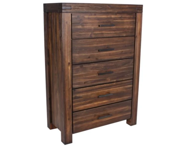 Add rustic charm and convenience to your bedroom with this stylish chest. It features five spacious drawers, including a felt-lined top drawer. The English dovetail construction and full extension ball bearing glides ensure this high quality piece lasts for years to come. The beautiful brown finish highlights the unique wood details and complements any color palette. Additional features include: acacia solids, full extension ball bearing glides, English dovetails, felt-lined top drawer, storage area