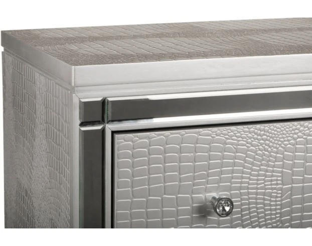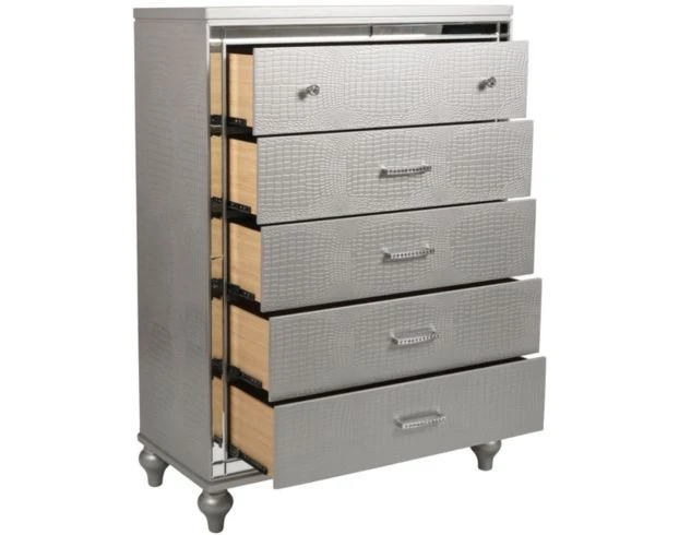 Enjoy eye-catching allure with this stylish chest. It features hardwood construction, mirrored accents, embossed detailing, English dovetail joinery, full extension glides and faux crystal hardware. The lustrous silver finish adds sparkle to any modern space.