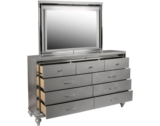 Enjoy eye-catching allure with this stylish dresser. It features hardwood construction, mirrored accents, embossed detailing, English dovetail joinery, full extension glides and faux crystal hardware. The lustrous silver finish adds sparkle to any modern space.