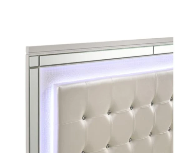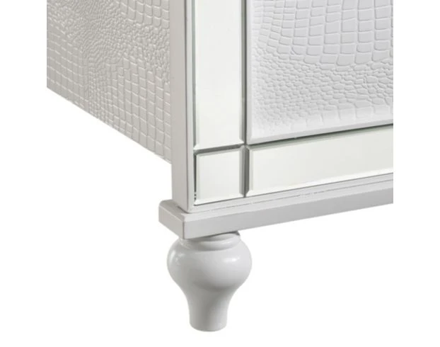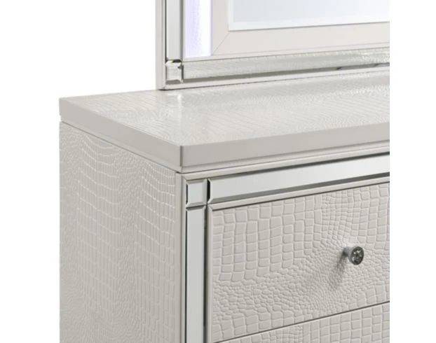 Enjoy eye-catching allure with this stylish bedroom set. It features a queen-size bed, dresser, mirror and nightstand with hardwood construction, mirrored accents, embossed detailing, English dovetail joinery, full extension glides, faux crystal hardware, beveled glass and built-in mirror and headboard lighting. The lustrous white finish adds sparkle to any modern space.