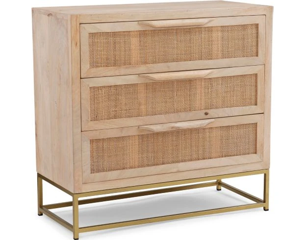 Simple and geometric, this three-drawer rattan cabinet offers versatile function without sacrificing distinctive style. With old world style and a neutral cream color, this piece has a beautiful natural texture while a metal frame adds a crisp shine with its gleaming gold finish. Blending elements from a variety of styles, this piece complements any home or office in both form and function. LOC 2F 8E
