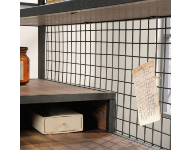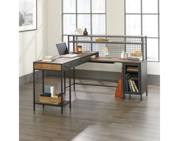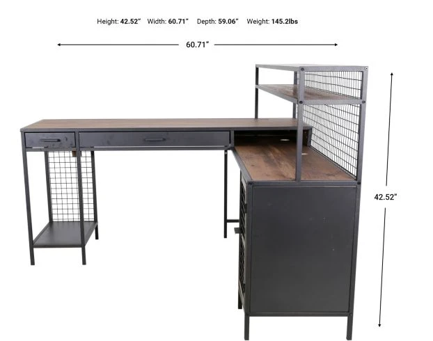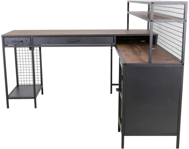 Add industrial style to your home office with this stylish desk. It offers ample storage and work space with a functional L-shaped design, two full-extension drawers, open shelving and a cabinet divided by an adjustable shelf behind a wire mesh door. The powdercoated frame, contrasting wood top and mesh detailing make this an easy addition to any home office.