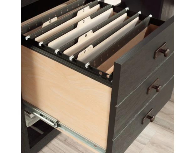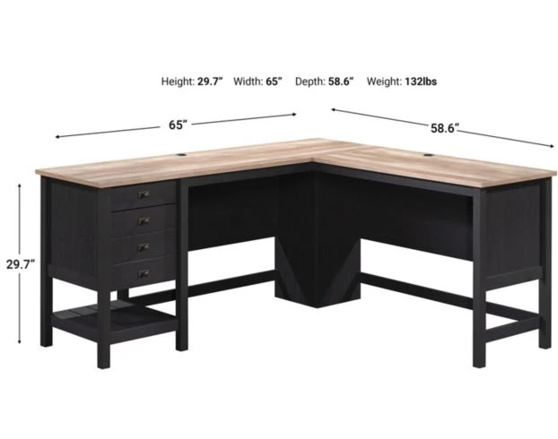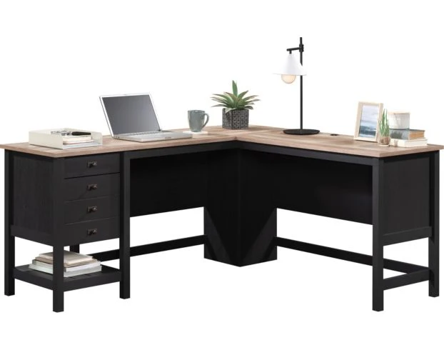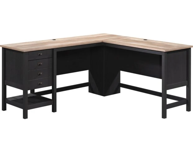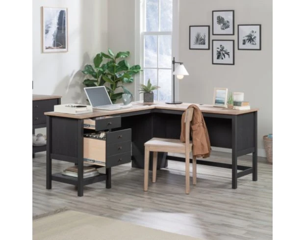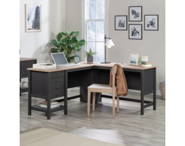Transform your home workspace with the Cottage Road black corner Desk. With its modern farmhouse style, this L-shaped desk with drawers features a spacious top surface that can hold your computer, lamp, and favorite family photos. Keep your desk organized with the two drawers that are perfect for storing letter-size hanging files and an open shelf for easy access to essentials. Additionally, this desk features two desktop grommet holes for hassle-free electronic cord organization. The raven oak finish with lintel oak accents offers a touch of familiarity with a fresh twist, making it a perfect fit for any room in your home. With its versatile design, this desk is finished on all sides, so you can place it wherever you like. Make your home workspace somewhere you want to be with the Cottage Road black corner desk.