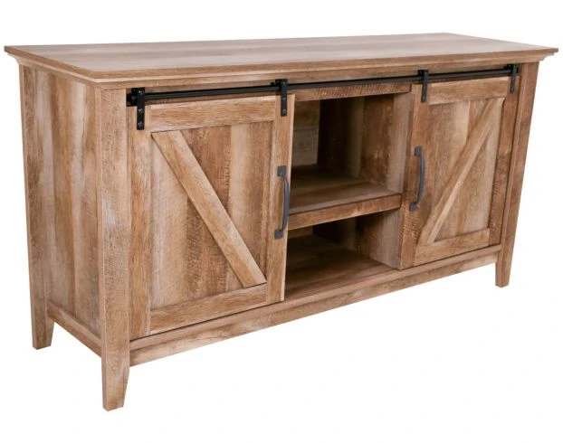 Add storage and style to your living room with this credenza. It features barn-style sliding doors revealing adjustable shelves and cord access. The light tone of the oak finish makes this piece complement any transitional palette.