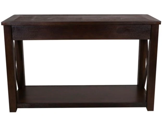 Add classic rustic style to your space with this charming sofa table. The stylish design features a framed planked top, X-shaped side panels and open shelf for storage and display. The hand distressing and oak finish make this an easy addition to any home. LOC:8F, 10F